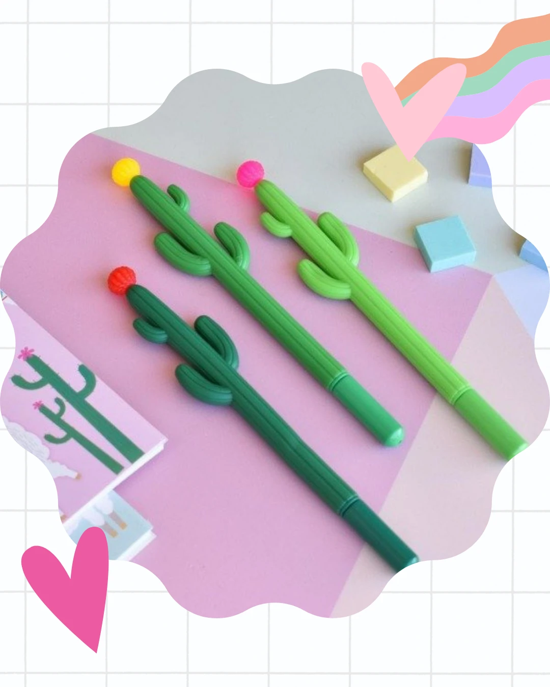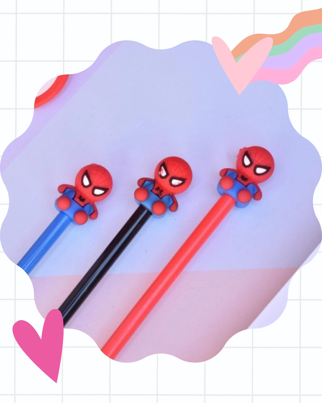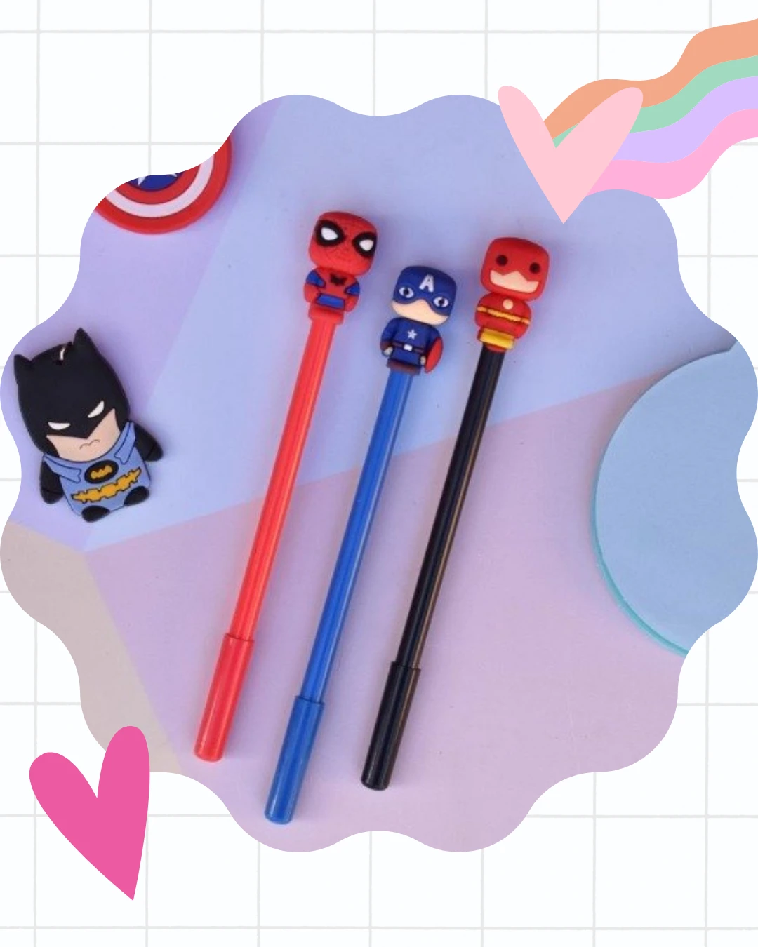 Lapiceras de tinta, recubiertas con goma y personajes en la parte superior