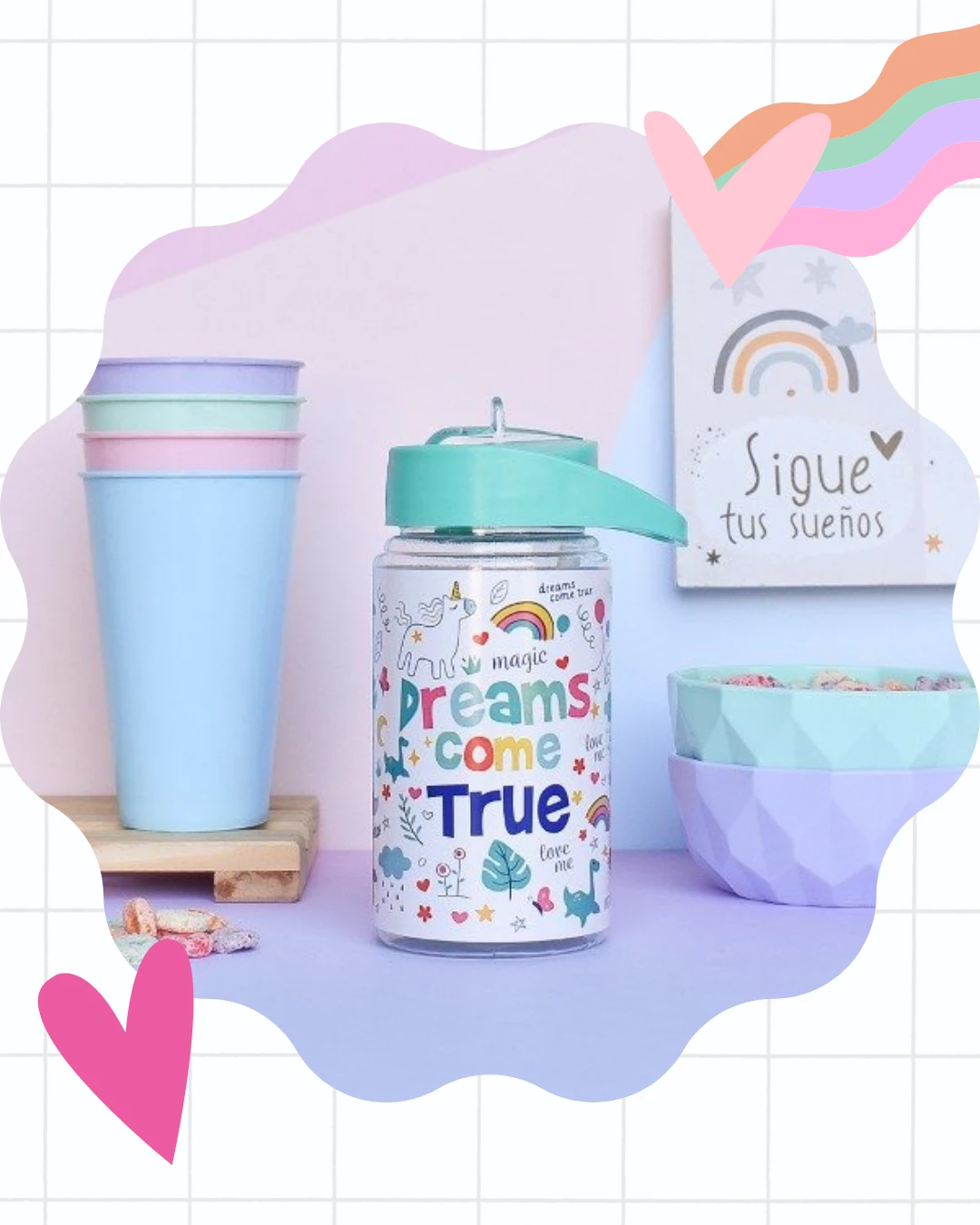 Descripción: Botella plástica con tapa a rosca, con pico y sorbete. Forrada con vinilo laminado brilloso u opaco en diseños infantiles